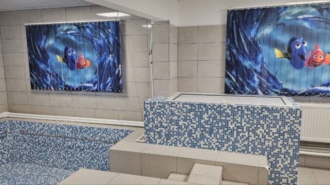 След основен ремонт и пълно обновяване, детският басейн вече придобива модерен облик. Извършен е демонтаж на старата облицовка и полагане на нова водоустойчива настилка, подово отопление и теракота в зоната около басейна и съблекалните. Монтирани са нови душове с линеен сифон, подменени са електрическите инсталации, осветлението и санитарията, а таваните и стените са боядисани с водоустойчив латекс.