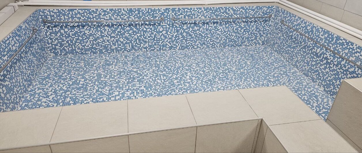 След основен ремонт и пълно обновяване, детският басейн вече придобива модерен облик. Извършен е демонтаж на старата облицовка и полагане на нова водоустойчива настилка, подово отопление и теракота в зоната около басейна и съблекалните. Монтирани са нови душове с линеен сифон, подменени са електрическите инсталации, осветлението и санитарията, а таваните и стените са боядисани с водоустойчив латекс.