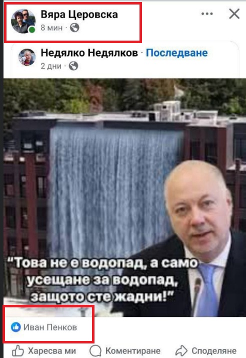 Вяра Церовска е споделила в социалната мрежа „Фейсбук“ хейтърски пост срещу премиера на ГЕРБ Росен Желязков. Постът е качен от журналистът , създал сайта ПИК Недялко Недялков и е споделен от Вяра Церовска. В него се подиграва водопада на хотела, който строи фамилията на премиера Росен Желязков.